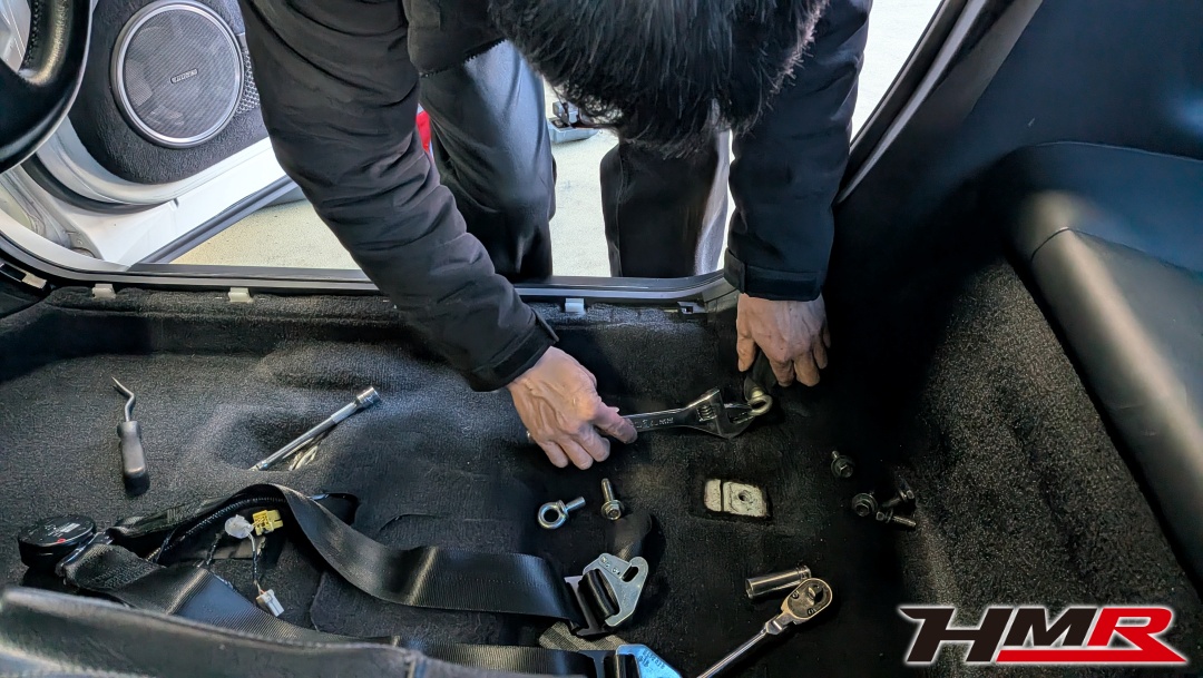 さて、続いて6点式ベルトの装着です。アンカーボルトをJAF規定の正規な位置にしっかりと付けます。簡易的にステーを追加して装着することもできますが、クラッシュ時の衝撃を知っている私はGT-Rの車重とスピードを考えると命の危険があるのでJAF規定でアンカーボルトを設置してもらいました。