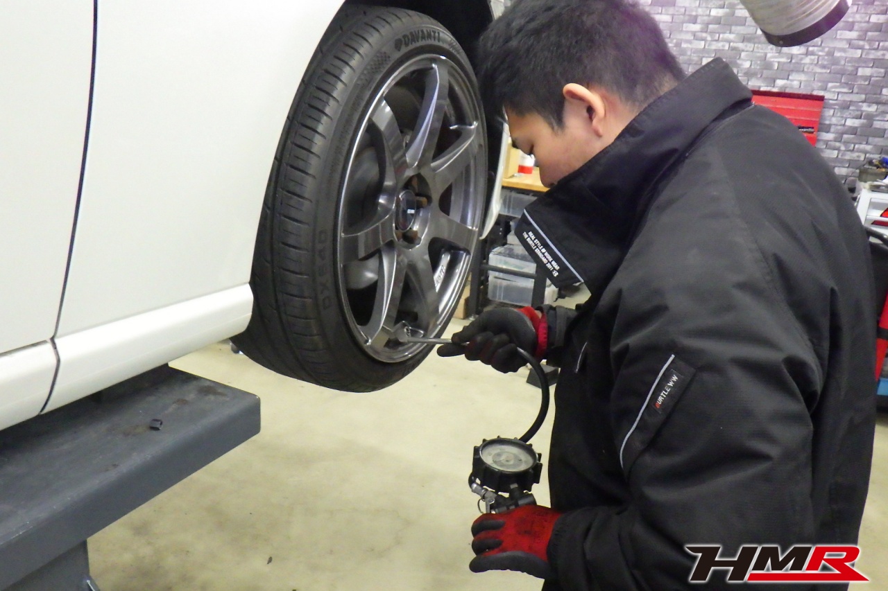 ハブベアリング・ボールジョイント、アーム・リンク類のガタ、ブッシュ・ブーツ類の劣化、エンジン・ミッション・デフからのオイル漏れと各マウント類、タイヤ溝の残量、空気圧の点検を行いました。タイヤの残り溝はフロント6.7mm・リア6.7mmでした。